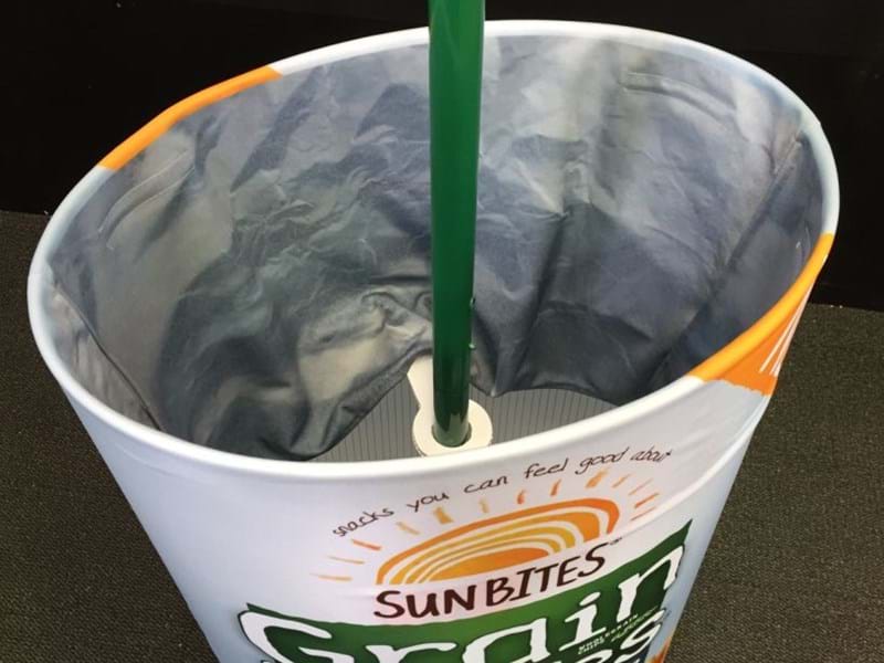 The solution was to design a clever oval shape, with the graphic stitched into “tips” so as to resemble the corners of a packet. The oval shape enabled the unit to stand on its own and retain its stability, whilst the wheels gave it easy manoeuvrability. We created some textured artwork for the inside of the trolley, which helped it to resemble the crinkled silver inside a chip packet.
