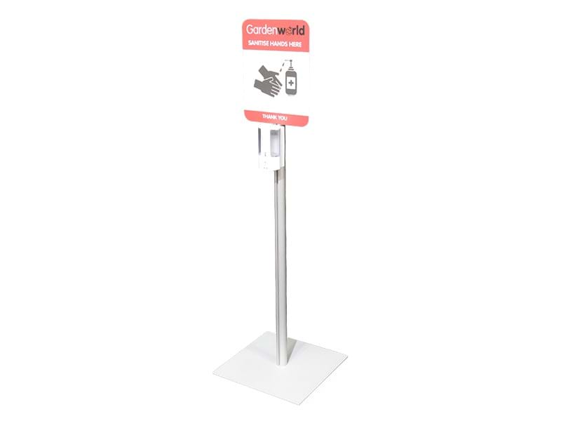 (Price includes: robust sanitiser station with steel base plate, personalised branding to both sides, touch-free dispenser to one side)