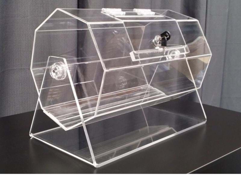 Large Competition Entry Box Size 310mm wide x 210mm deep x 240mm high Header board A4 size Entry slot 150mm wide x 10mm thick Available in clear or smoked colour Two keys included with each box |