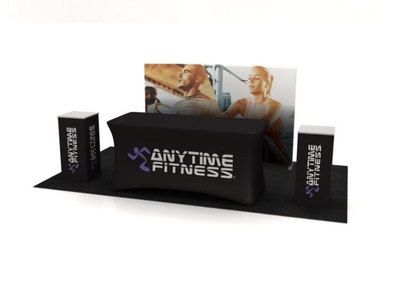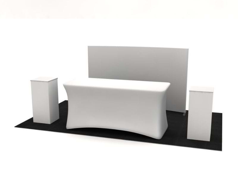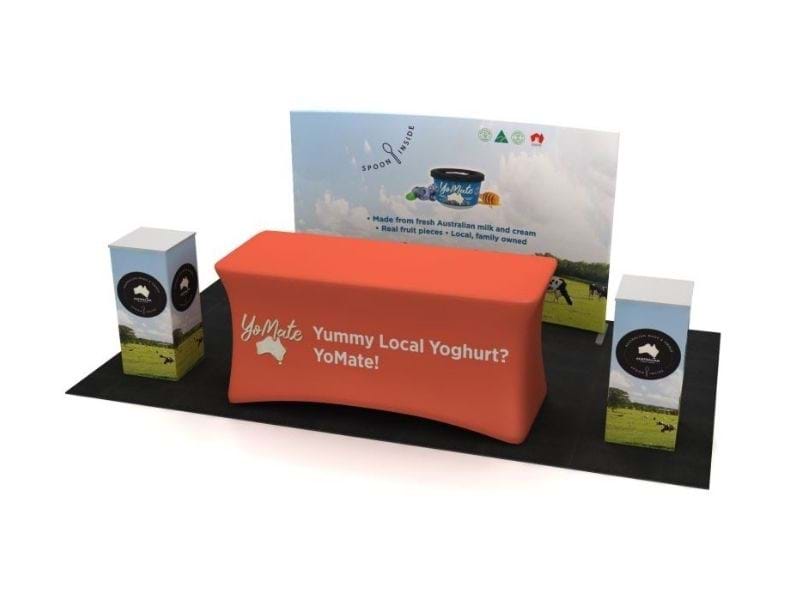 The kit features a 2.4 metre wide free-standing single-sided SuperWall graphic backdrop at height of 1.5 metres, a 1.8 metre wide folding trestle table with customised stretch table cover, and two folding pedestals with permanent graphics to all four sides of the pedestal base. Pedestals can be used for display of products, brochures, laptops, tablets, or other marketing material.