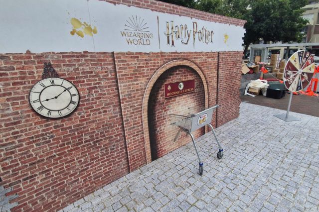 To allow the client to store product samples for easy replenishment during the course of the day, we built a storage room behind the set wall, complete with intricate hand-sawn “brickwork” along the edges, To manage expected high foot traffic we installed silver rope bollards along one edge to guide a queuing system - which had the added bonus of creating an air of exclusivity. Half a sawn-off trolley attached to the back wall completed the immersive Harry Potter experience, while also providing visitors with the opportunity to take some memorable photos of their very own journey to Platform 9¾.